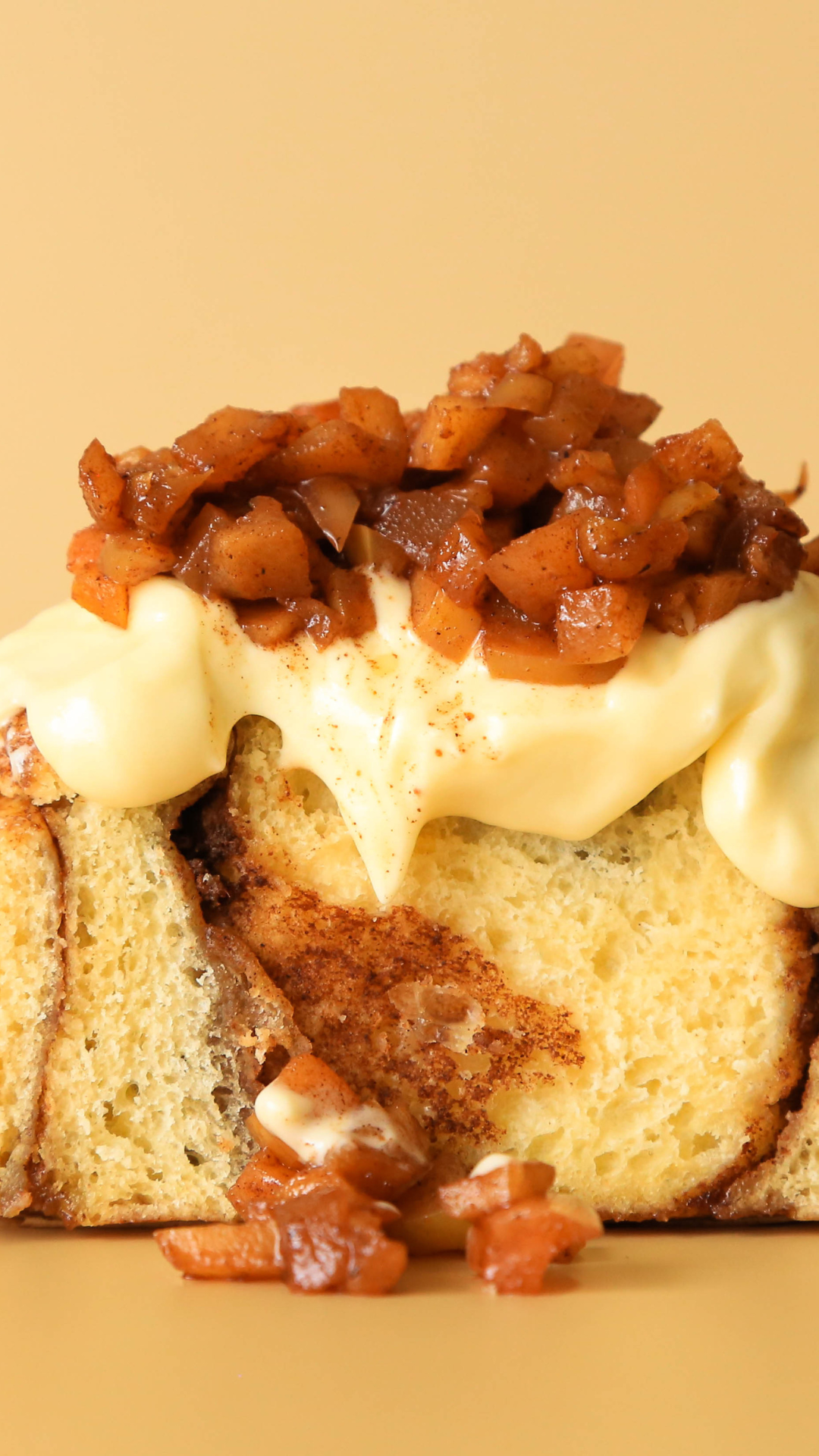 Filled with stewed spiced apple and our sticky cinnamon sugar mixture. Topped off more spiced apple, vanilla cream cheese frosting and a spiced oaty crumble.