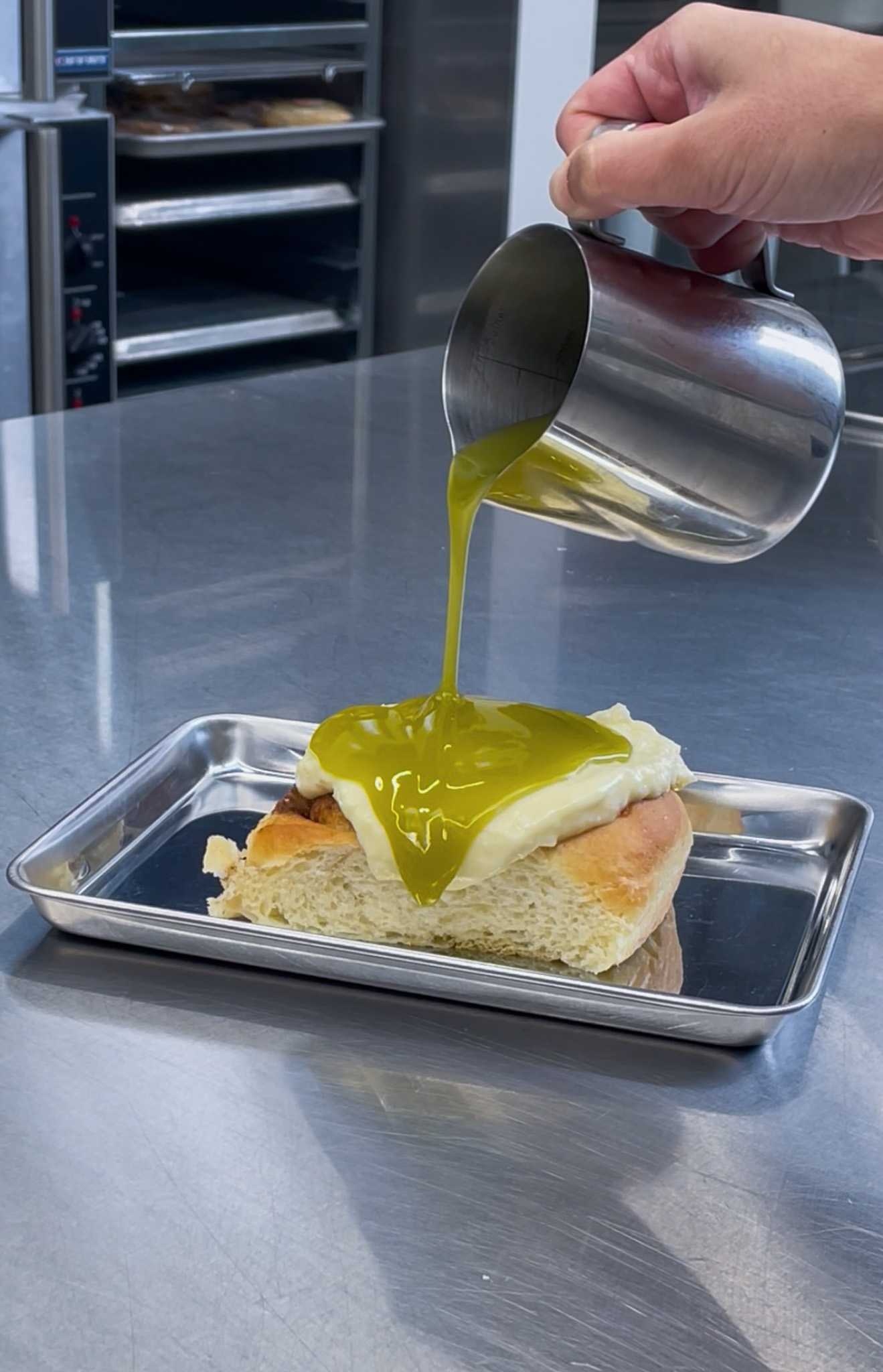 House made Pandan Kaya jam is poured over sweet and slightly coconutty, cinnamon spiced buns. Topped off with coconut cream cheese frosting